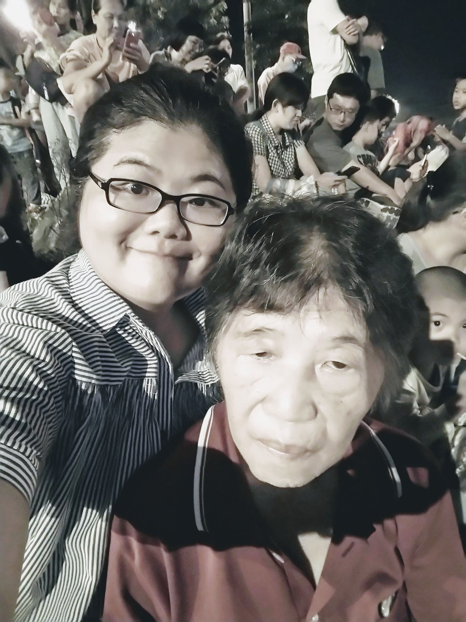 步行到附近接近河邊的地方等看煙火,人潮多多,還不錯的是沒太累到阿母,可以有草皮坐著休息等煙火施放時間到。