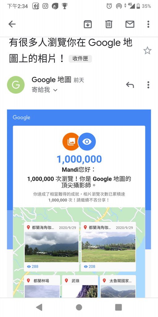 圖片【達成一百萬次瀏覽】 2020-10-222020-10-22發表在 生活印記 中發表留言 我的一百萬。 我在Google地圖上的照片,今天Google信件通知我,終於達成一百萬次的瀏覽,我已是「頂尖攝影師」,也拿到徽章了!朝2,000,000次繼續努力。 分享此文: 按一下即可分享至 X(在新視窗中開啟) X 按一下以分享至 Facebook(在新視窗中開啟) Facebook 分享到 LinkedIn(在新視窗中開啟) LinkedIn 分享到 Reddit(在新視窗中開啟) Reddit 分享到 Tumblr(在新視窗中開啟) Tumblr 分享到 Pinterest(在新視窗中開啟) Pinterest 分享到 Pocket(在新視窗中開啟) Pocket 按一下以分享到 Telegram(在新視窗中開啟) Telegram 分享到 WhatsApp(在新視窗中開啟) WhatsApp 喜歡 正在載入...